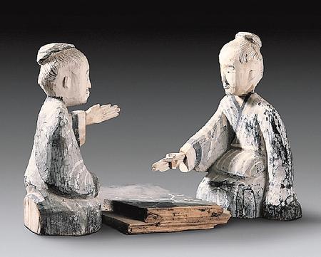 出土于西漢晚期48號(hào)墓的六博俑,包括一件棋盤、兩件俑。棋盤長(zhǎng)29.2厘米,寬19.3厘米,呈長(zhǎng)方形,黑色涂底,上面繪有白色“規(guī)矩紋”圖案,好似棋格;木俑高28.5厘米,為兩位跪坐相向?qū)牡睦夏昴行浴I碇荫砰L(zhǎng)袍,梳圓髻,留胡須,全身以黑白為主色。