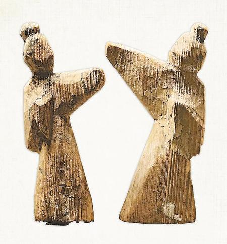 舞俑有獨(dú)舞俑和對(duì)舞俑兩種組合,舞者主要通過(guò)手臂的屈伸表現(xiàn)出舞蹈姿勢(shì)。通常先雕出舞俑姿態(tài),然后以白色為底色,用墨線和紅線繪頭發(fā)、衣袖,下垂處呈圓角方形。面部五官基本被省略,主要突出的是動(dòng)態(tài)的翩翩舞姿。高度通常在20厘米左右。