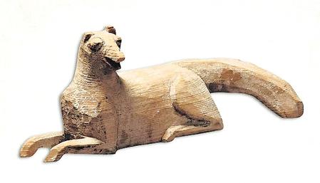 狗俑長(zhǎng)度在14-24厘米左右。先雕刻出輪廓,墨色線條勾出眼、耳及身上的毛發(fā),造型多樣,且以臥木狗俑較多,雙耳豎立,頭搭在前伸的雙腿或前爪上。這其中不僅有原木色作底、墨線勾勒的臥姿木狗俑,還有通體施白漆,墨線描繪耳、嘴、眼、前爪及背部、尾部的鬃毛,雕刻成分甚少,無(wú)任何肢體動(dòng)作,卻唯獨(dú)將雙耳豎起,展現(xiàn)警覺性的臥姿木狗俑。