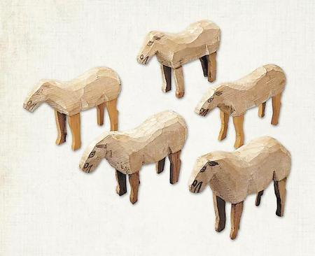 木羊俑長(zhǎng)度為18-20厘米。皆以白色作底,只在頭部用墨色略加勾畫,繪出耳朵、眼睛、鼻孔和微張的嘴,造型簡(jiǎn)潔,身軀較肥,頭部較瘦。羊俑造型題材也體現(xiàn)出涼州地區(qū)畜牧業(yè)水草豐茂的特色。