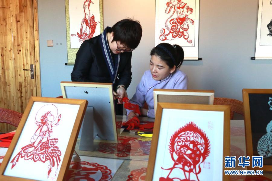 在甘肅敦煌小鎮(zhèn)鳴沙書院,“敦煌剪紙”酒泉市級非物質(zhì)文化遺產(chǎn)代表性傳承人莊生娟(左)在自己的工作室內(nèi)指導(dǎo)學(xué)員剪紙(2020年12月31日攝)。新華社發(fā)(張曉亮 攝)