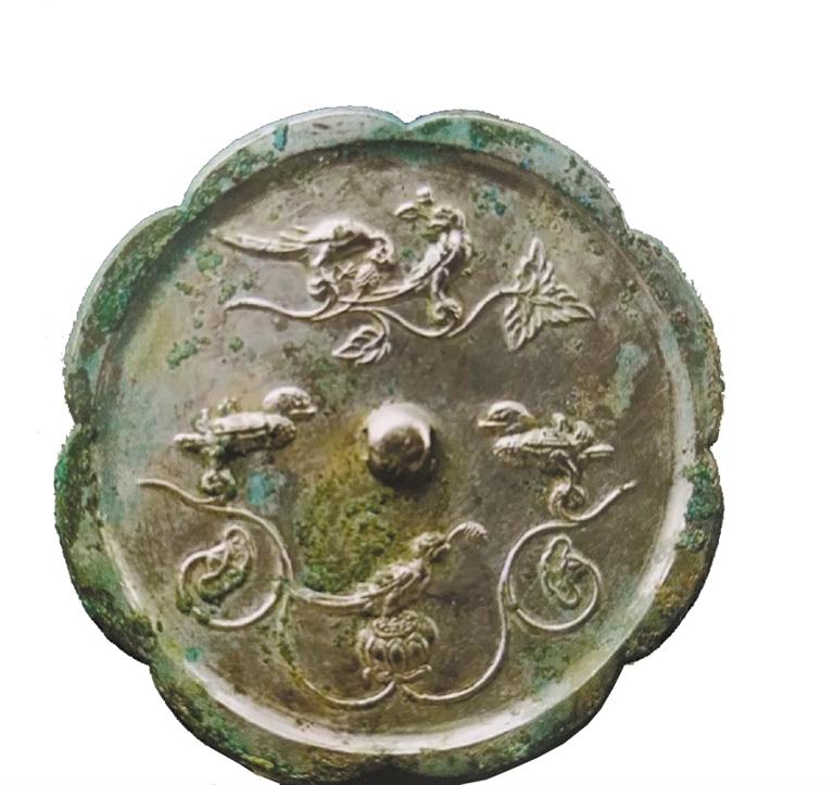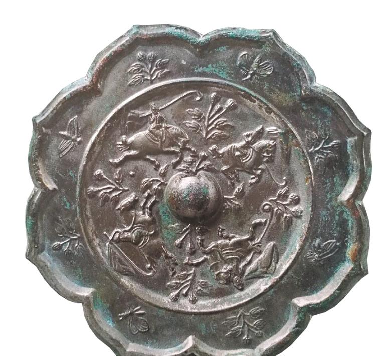 隋唐時期是中國封建政治經濟文化高度發(fā)展繁榮的時期,唐代社會經濟全面發(fā)展,手工業(yè)各部門也都興旺發(fā)達,青銅鑄造業(yè)中的銅鏡業(yè)尤為突出,無論造型、題材、紋飾、鑄造工藝,都突破了前代的模式,達到了中國古代銅鏡藝術的巔峰。唐鏡鏡型厚實,方形鏡、菱花形鏡、葵花形鏡流行;紋飾題材多見瑞獸、飛鳥以及葡萄、花草等;瑞獸葡萄鏡最具特色,是中西文化融合的杰作。