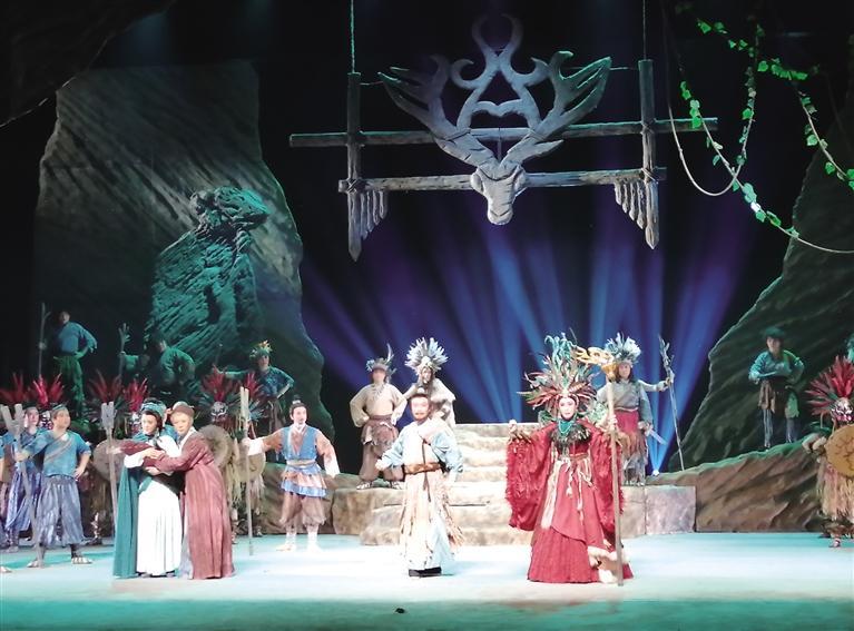 第三個(gè)步驟是大禹與土著山民首領(lǐng)山戎在強(qiáng)烈戲劇沖突中果斷地在改變自己的行為,并且以“忘我”的犧牲精神求得“天地之和,和在心中”的主旨意義。任何對(duì)自然生態(tài)的態(tài)度和沖突到頭來都集中體現(xiàn)在“人與人”的觀念習(xí)俗情仇恩怨的激烈紛爭之中。是故治水,也要“治理”自己的行為,升化自己的心智,以自己的真情坦露大愛, 甚或犧牲自己的性命。這就是“戲”的魅力。