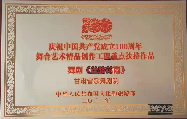 中國甘肅網(wǎng)12月19日訊 12月18日,文化和旅游部在山東省青島市召開的“2021年全國藝術創(chuàng)作工作會議”上,發(fā)布了“慶祝中國共產(chǎn)黨成立100周年舞臺藝術精品創(chuàng)作工程”入選名單,頒發(fā)了“慶祝中國共產(chǎn)黨成立100周年舞臺藝術精品創(chuàng)作工程獎牌”。甘肅省文化和旅游廳遴選推薦的舞劇《絲路花雨》《大夢敦煌》《彩虹之路》、隴劇《官鵝情歌》、小品《你笑起來真好看》等5部舞臺藝術精品,經(jīng)文旅部評審正式入選“舞臺藝術精品創(chuàng)作工程重點扶持作品”。甘肅省歌舞劇院創(chuàng)排的舞劇《絲路花雨》作為12家“百年百部”工程受獎單位在全國藝術創(chuàng)作工作會議上接受獎牌和榮譽證書,甘肅省文旅廳、山東省文旅廳等參會代表12家領獎單位上臺領獎,充分展現(xiàn)了文旅部對甘肅省入選作品質量及組織工作的高度肯定。