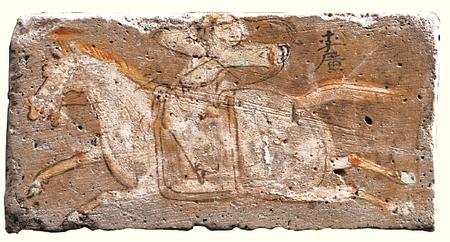 敦煌市博物館藏的西晉李廣射虎彩繪畫像磚表現(xiàn)的是“李廣射虎”的情景。李廣頭戴冠,八字須,著交領(lǐng)窄袖衣,系腰帶,下身著裈,騎于疾奔的馬上返身張弓待發(fā)。李廣射虎的故事被記載于司馬遷《史記》中,原文是:“廣出獵,見草中石,以為虎而射之,中石沒鏃,視之石也。因復(fù)更射之,終不能復(fù)入石矣。廣所居郡聞有虎,嘗自射之。及居右北平射虎,虎騰傷廣,廣亦竟射殺之。”