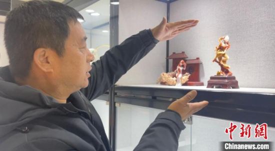 圖為玉雕手藝人李學(xué)平向記者展示自己用“巧雕”技藝雕刻的敦煌飛天系列作品?!「攥摗z
