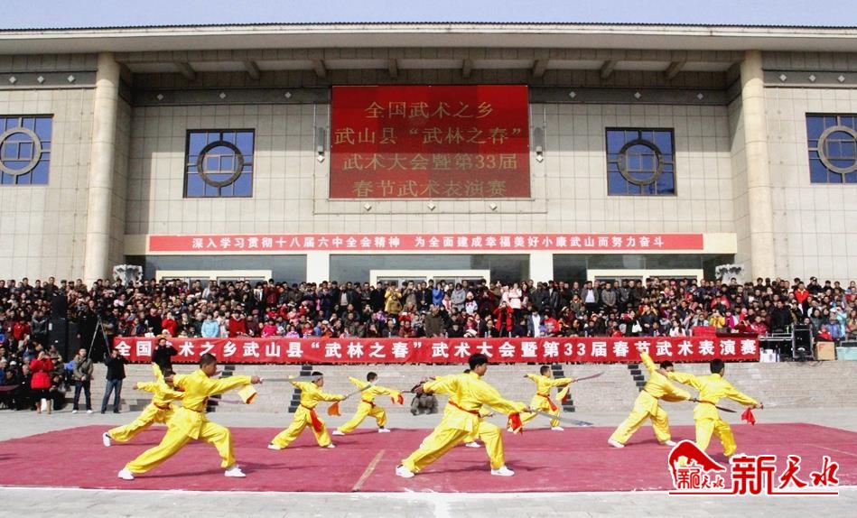 有武——武山是“全國武術(shù)之鄉(xiāng)”。全縣習(xí)武蔚然成風(fēng),有六合拳、八步轉(zhuǎn)等地方拳和國家套路、梅花槍、通備拳、硬氣功、太極拳等門類,常年習(xí)武人數(shù)達7萬多人,每年正月舉辦全縣武林之春武術(shù)表演大會。