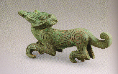 禮縣大堡子山祭祀樂器坑出土,共三只,造型相同,大小相似,為全國虎伴樂器出土的首例。其形象回首卷尾、聳耳曲爪、憨態(tài)可掬,極具觀賞性,是春秋時期虎造型的杰作,體現了秦國早期高超的造型能力和精湛的鑄造技術?;⒌男蜗笤诖呵锴厝说钠魑镏卸嘁?,不但有自成個體的金虎、青銅回首虎,同時虎作為附飾也出現在一些大的青銅器上。