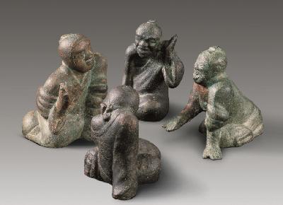 四俑相向跪坐,身著漢代最常見的高領衣服。二人頭頂盤挽發(fā)髻,二人以寬巾裹首。坐姿不同,形態(tài)各異,最為精彩有趣的是四俑的面部表情,或喜笑顏開,或怒不可遏,或凝神沉思,或憂傷悲愁。
