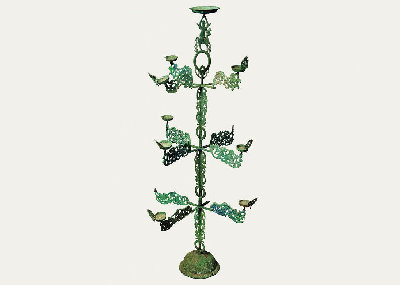 燈座為倒置喇叭形,座面飾瑞獸紋和云氣紋。燈呈樹形,主干分為三段,套插而成,段與段銜接處各置十字形托架,猶如燈樹之分枝。十字托橫向四出,四端各飾透雕花葉一個,象征火焰,干枝頂端有仙人騎鹿形花飾。原有燈13盞,現存9盞。