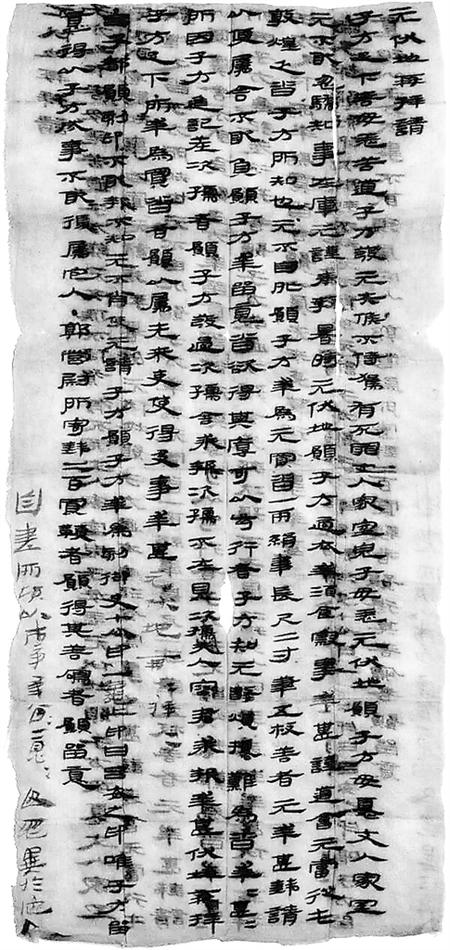 子方足下,善毋恙!苦道子方發(fā),元失候不侍駕,有死罪。丈人、家室、兒子毋恙,元伏地愿子方毋憂(yōu)。丈人、家室元不敢忽驕,知事在庫(kù),元謹(jǐn)奉教。暑時(shí)元伏地愿子方適衣、幸酒食、察事,幸甚!謹(jǐn)?shù)溃簳?huì)元當(dāng)從屯敦煌,乏沓,子方所知也。元不自外,愿子方幸為元買(mǎi)沓一兩,絹?lái)f,長(zhǎng)尺二寸;筆五枚,善者,元幸甚。錢(qián)請(qǐng)以便屬舍,不敢負(fù)。愿子方幸留意,沓欲得其厚、可以步行者。子方知元數(shù)煩擾,難為沓。幸甚幸甚!所因子方進(jìn)記差次孺者,愿子方發(fā)過(guò)次孺舍,求報(bào)。次孺不在,見(jiàn)次孺夫人容君求報(bào),幸甚,伏地再拜子方足下!所幸為買(mǎi)沓者,愿以屬先來(lái)吏,使得及事,幸甚。元伏地再拜再拜!