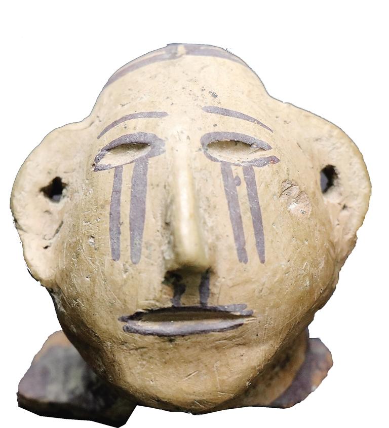 姓名:馬家窯文化馬廠類型人頭形彩陶器蓋 出生年代:距今約4350—4050年左右 住址:臨夏市博物館 體型:面部長6.5厘米,寬6.5厘米,頭頂至后頸長5.5厘米 自我描述: 我是國家一級文物。1992年,博物館工作人員從臨夏市王坪村村民手中收購了我。我是由泥質(zhì)紅陶捏塑而成,我的表面略磨光,施黑彩,窄額長臉,橢圓形眼,繪有眉毛,眼窩深陷,高鼻有鼻孔,雙耳較長、呈半圓形,雙耳有小孔,大嘴微張,發(fā)式為直發(fā)、中分。頭發(fā)、眼輪廓線、嘴輪廓線均為黑彩繪就。特別值得一提的是,在我的雙眼下方臉頰上的雙直線條,仿佛是奪眶而出的眼淚。