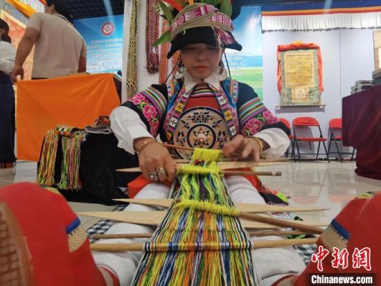 中新網(wǎng)甘肅張掖6月8日電 (閆姣)腳蹬紡織板,手持木梭子,甘肅甘南藏族自治州舟曲縣藏族姑娘全庸卓瑪坐在地上,展示省級(jí)非遺織錦帶,藏族婦女用其束腰、扎靴。她說,這項(xiàng)技藝后繼乏人,希望通過這種“走出去”的活動(dòng),讓更多人了解這一獨(dú)特文化。