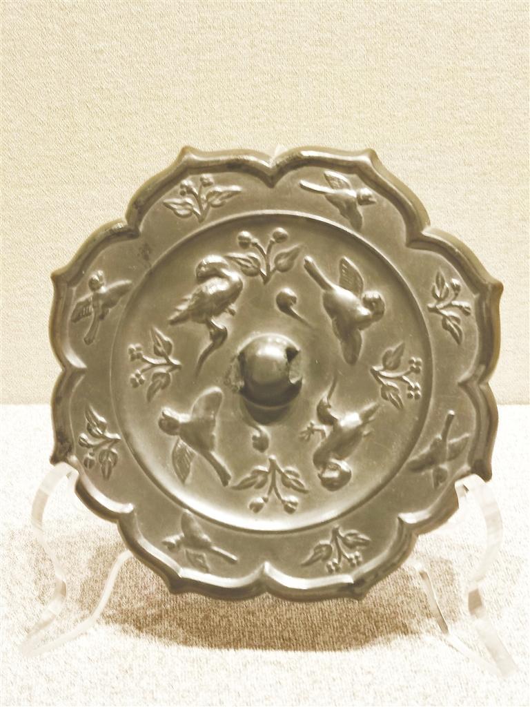 平?jīng)鍪胁┪镳^藏,唐代,八瓣菱花形,內切圓形,圓鈕。上下左右交隔對稱分布四只鸞鳥、四枝二葉二苞折枝花。