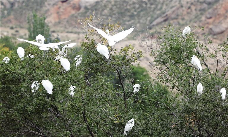 中國甘肅網(wǎng)10月14日訊 據(jù)蘭州日報(bào)報(bào)道 金秋十月,蘭州新區(qū)秦王川國家濕地公園秋意漸濃。近日,隨著近百只白鷺的光臨,秦王川國家濕地公園再次迎來了候鳥遷徙的高峰期,成群的白鷺憩息在樹枝,繪就了一幅亮麗的秋景圖。