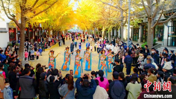 11月中下旬,在甘肅省天水市秦州區(qū)“黃金大道”上演了“絲路舞姿”,舞蹈是由秦州區(qū)文旅局組織的舞蹈隊(duì)帶來(lái)的舞蹈《絲路》《醉太平》和《萬(wàn)疆》等。該路段由于216株銀杏樹(shù)的金黃色樹(shù)葉彼此參差相連,宛如兩條“黃金色帶”在道路兩側(cè),所以被當(dāng)?shù)鼐用穹Q(chēng)為“黃金大道”。