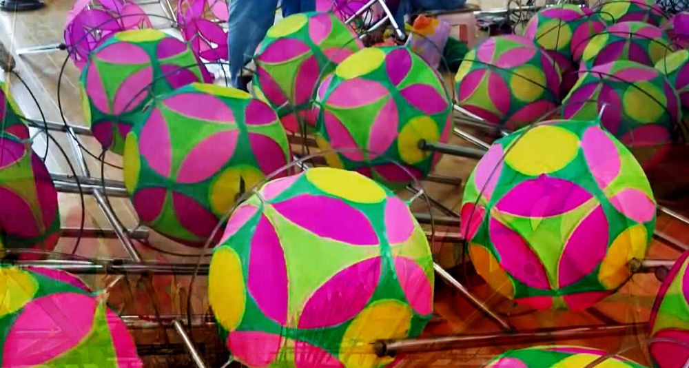 張安邦今年65歲,自其太祖輩起,代代都是技藝嫻熟的滾燈人,到他手里已經(jīng)是第三代了。明清時(shí)的滾燈,燈架、燈盤、轉(zhuǎn)軸都是木制的,花燈是用竹條或柳條編織,解放前改成了羅圈骨架,而現(xiàn)在經(jīng)過他改良的景泰滾燈,則是用高碳鋼絲制作而成。