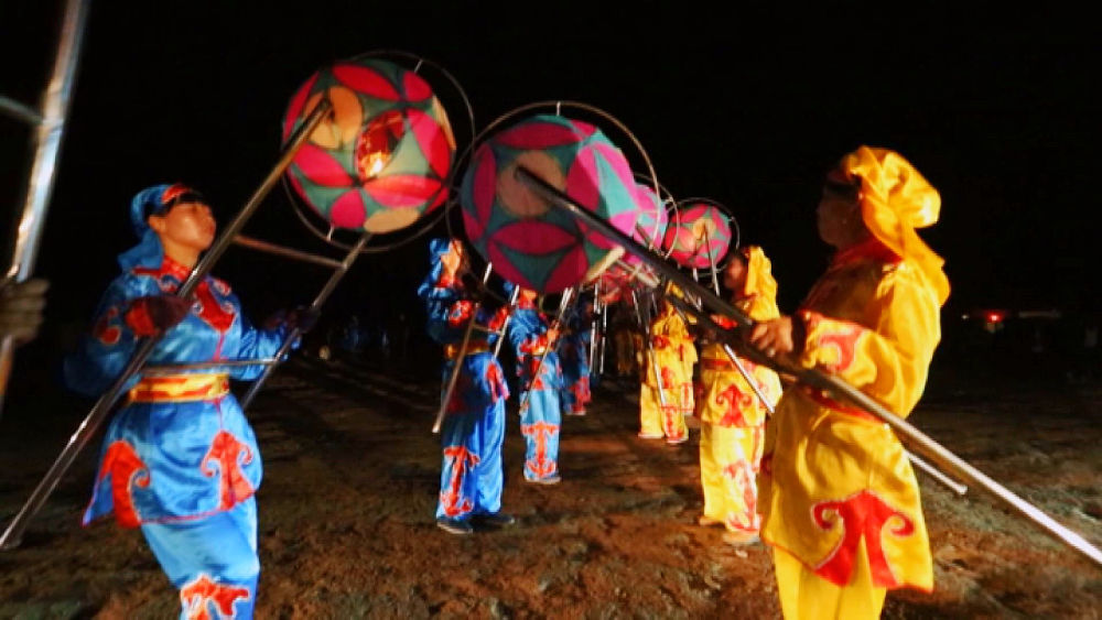 景泰滾燈由燈籠和燈架組成,燈籠分里外兩層,為圓形,外層轉(zhuǎn)動(dòng)內(nèi)層固定,燈籠外層用彩紙或紗綢裱糊。表演者手執(zhí)燈架,輕輕一碰地面,燈籠便轉(zhuǎn)動(dòng)起來。夜晚,彩燈滾動(dòng),猶若五彩斑斕的長(zhǎng)龍,扭曲躍動(dòng),時(shí)慢時(shí)快,回頭擺尾往復(fù)盤旋,交響輝映,別有一番情趣。