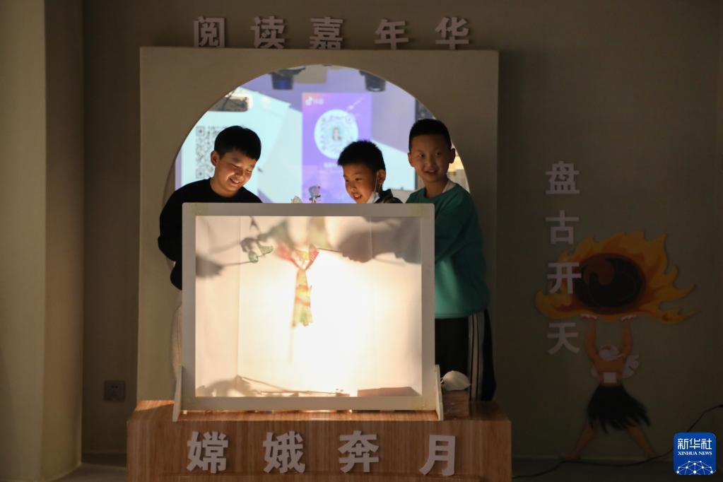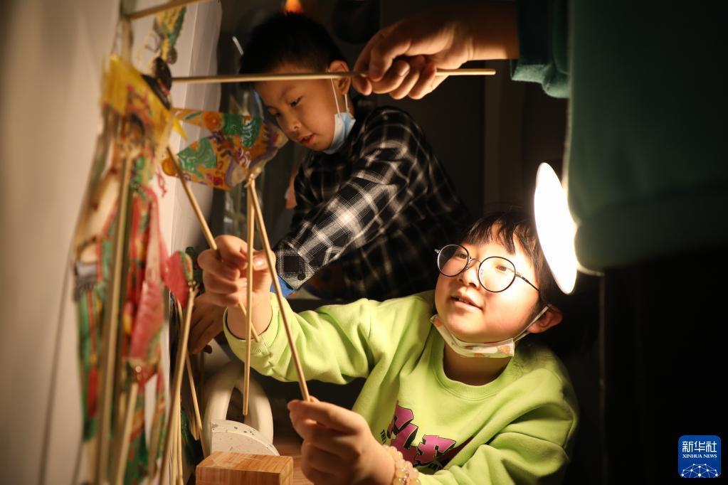 4月1日,在甘肅省蘭州市的讀者出版集團(tuán)數(shù)字閱讀中心讀者小站,小朋友體驗(yàn)中國(guó)神話(huà)故事主題皮影戲。新華社記者 馬希平 攝
