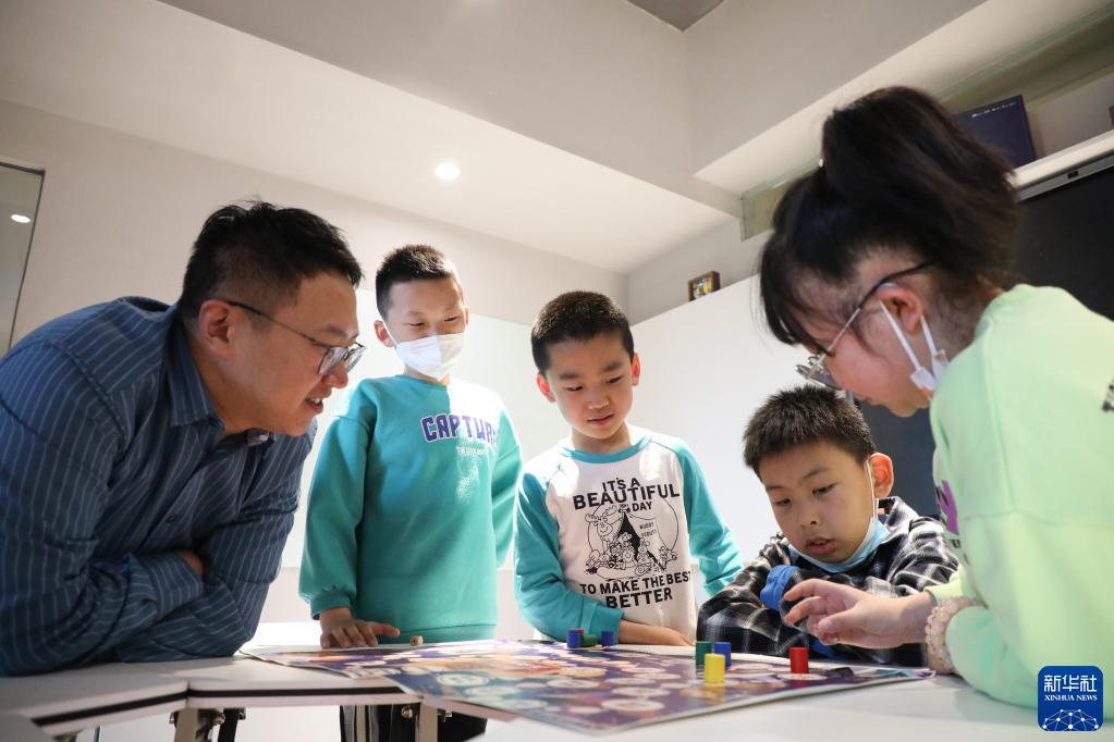 4月1日,在甘肅省蘭州市的讀者出版集團(tuán)數(shù)字閱讀中心讀者小站,工作人員與小朋友一起玩“講述中國(guó)神話(huà)故事”的飛行棋游戲。新華社記者 馬希平 攝
