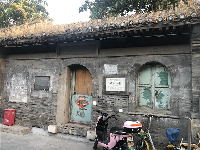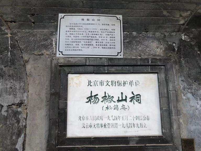 就是在這個(gè)胡同里,我看到一個(gè)歇山式屋頂?shù)姆课?,但已相?dāng)?shù)钠茢?,屋頂上長滿了凄凄荒草,門窗皆已破爛不堪。但是門旁的墻壁上卻鑲嵌著一塊匾,近前一看,上面寫著“楊椒山祠”。喲,這就是楊椒山在北京的祠。
