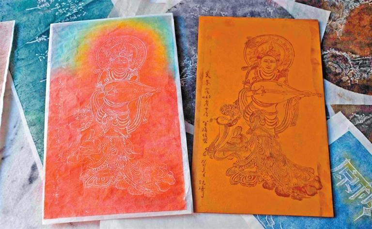 走進(jìn)工作室,墻壁四周掛滿了雅致的傳拓字畫(huà),阮琦也向記者講述了拓印畫(huà)——“拓印敦煌”系列的始末。