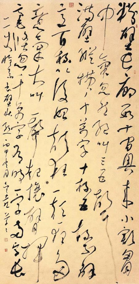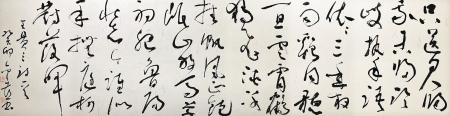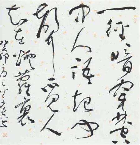 走出去,站在全國的高度,集中進(jìn)行學(xué)習(xí)和交流,對一個立志進(jìn)取的書法家,可以說是一個脫胎換骨的修煉,中國書法發(fā)展的當(dāng)代狀態(tài),成為進(jìn)取的最大參照,風(fēng)格極力貼近時代風(fēng)尚,在此基礎(chǔ)之上加入個人的鮮活語素,在作品中即表現(xiàn)出了時尚,又有自己的構(gòu)想,才有自己的一席之地。侯金喜抓住時代脈搏,積極捕捉在展覽中尚處于不顯眼的元素,不斷加以顯化,使個人的作品在龐大的展出體系中獨(dú)具風(fēng)采,難度可想而知,在高手如林的態(tài)勢下,侯金喜知難而上、刻苦磨煉,向經(jīng)典取法,向當(dāng)代名家問路,雙向融合、求新求變,經(jīng)過了這樣一個長的時段的求索,他的草書在全國眾多的草書家中拔地而起,引發(fā)了廣泛的關(guān)注。看他的草書,變化的度把握在了一個比較妥帖的度上,他不以奇異詭變?yōu)槌缟?,筆畫塑造大體以傳統(tǒng)語言為宗,使柔和與剛健統(tǒng)馭在一起,這種立意基本圍繞中國書法流變的中軸線,可以受到時間的考驗(yàn),在一些筆畫中注入的時代信息,經(jīng)過個人的藝術(shù)提煉,具有了新的生氣。在結(jié)構(gòu)選擇上,他同樣進(jìn)行了深思熟慮,反復(fù)篩汰了過度追求時髦的招數(shù),一直強(qiáng)調(diào)深層次的內(nèi)涵,把一個結(jié)體放在歷史的縱向上反復(fù)琢磨,他自己認(rèn)為,形象造型只有沿著時序的推進(jìn),才能有機(jī)地融入歷史,成為藝術(shù)的終極選擇,所以侯金喜的探索是審慎的,邁進(jìn)是疊復(fù)的,我們欣賞他的作品,可以看出他思考的勤謹(jǐn),每一個階段都有不同的表達(dá),欣賞者隨著他的筆觸的流瀉,可以領(lǐng)略到豐富的視覺享受。