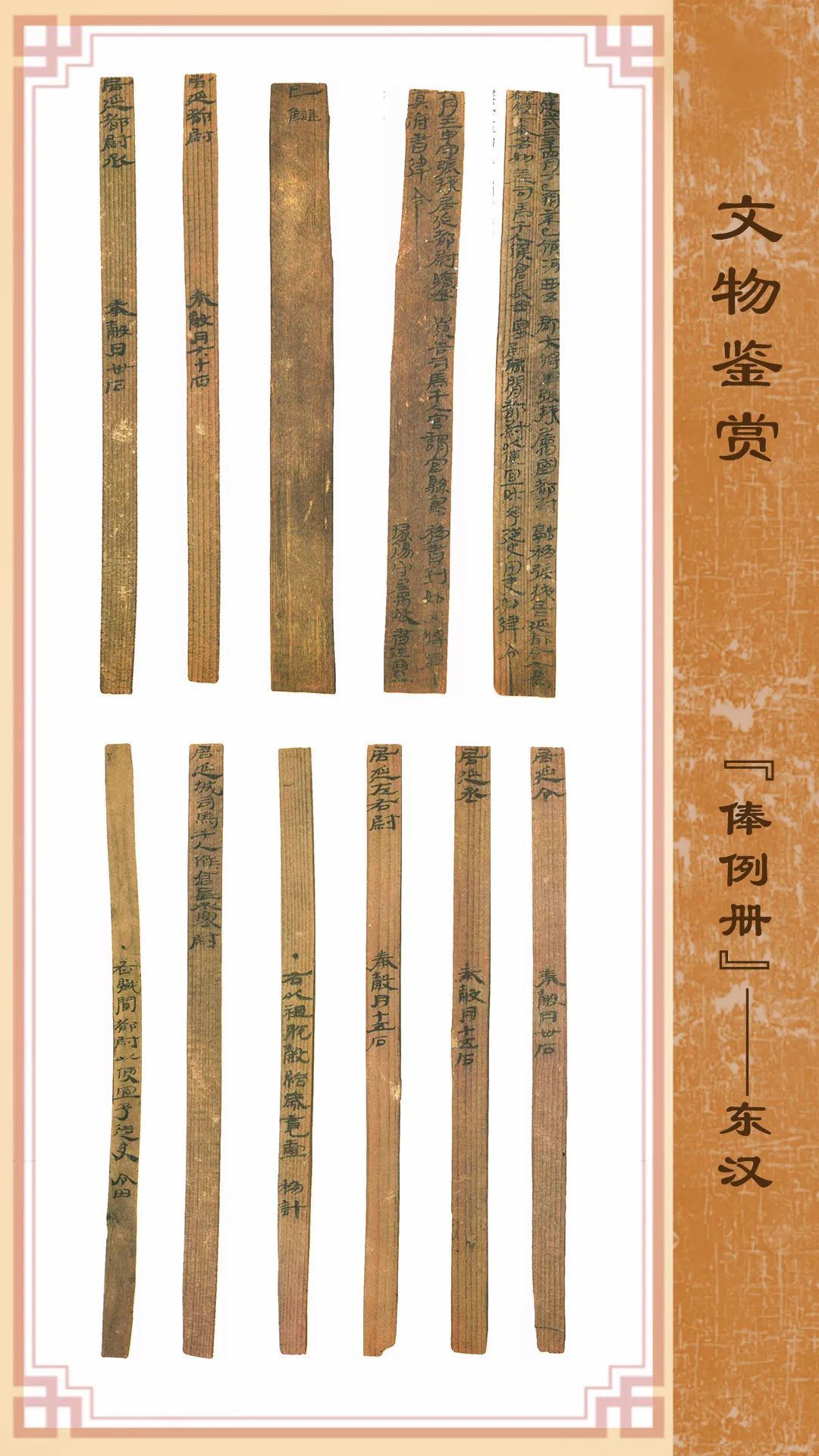 1974年8月出土于甲渠候官遺址第22號房址內。簡冊由10枚簡組成,每簡長22.8厘米,前兩簡寬2.5厘米,其余8簡寬1.4厘米。全文200字。內容為東漢建武三年(公元25年)竇融統(tǒng)治河西期間留下的一份完整的財政文書。簡文是關于居延都尉府吏員奉谷標準的通知,由領河西五郡大將軍張掖屬國都尉竇融幕府下發(fā),簡言“如律令”可知其指令具有法律效力。