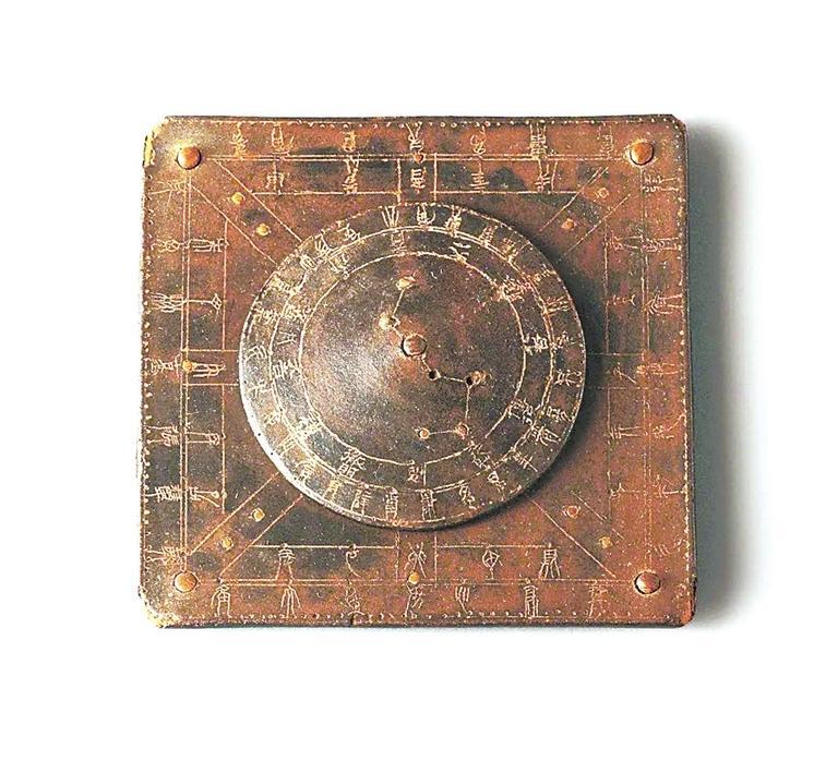 天、地盤(pán)邊緣均刻有許多小圓點(diǎn)作標(biāo)度,天盤(pán)現(xiàn)存刻度150余個(gè),地盤(pán)存182個(gè)。地盤(pán)四角各鑲嵌一大竹珠,以表“四維”;由兩條平行陰線組成的斜帶,平分四個(gè)盤(pán)角并與天盤(pán)相接,以象“八道”。所刻八干,分別代表四方。