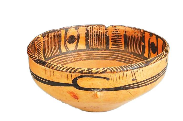 這件距今5000多年的古代彩陶作品,制作精致,圖案精美,人物形體鮮明,造型和動(dòng)作既抽象又生動(dòng)。彩陶盆通高11.3厘米,口徑24.5厘米,底徑9.8厘米,細(xì)泥制作,唇外侈,略鼓腹,腹部?jī)蓚?cè)有對(duì)稱(chēng)的小鈕??谘貎?nèi)壁為四組雙人抬物圖案,中間以橫豎線條組成的幾何圖案間隔,形成一周四方連續(xù)的紋飾帶,繪制于陶盆內(nèi)側(cè)上部,二人的頭部以圓點(diǎn)代表,軀干和四肢以線條描繪。兩人相向站立,共同抬起一個(gè)碩大的圓形物體,畫(huà)面簡(jiǎn)潔而生動(dòng),寥寥數(shù)筆就將人抬重物時(shí)雙腿開(kāi)立、腰背微屈用力的形態(tài)刻畫(huà)得惟妙惟肖。陶盆上精妙的紋飾讓它成為我國(guó)最早在彩陶上表現(xiàn)原始先民勞作場(chǎng)景的藝術(shù)珍品。