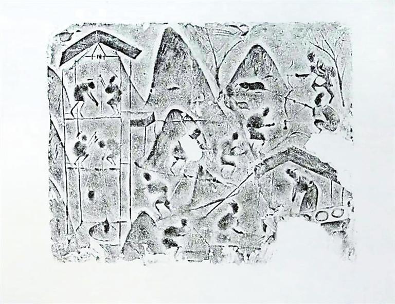 巴蜀地區(qū)是中國(guó)乃至世界鹽業(yè)最早的起源地之一,史載戰(zhàn)國(guó)時(shí)期巴蜀就已開(kāi)鑿鹽井、汲鹵煮鹽。秦在此設(shè)鹽官,至漢代,四川地區(qū)的井鹽制作已經(jīng)具有一定的規(guī)模,分工細(xì)致,工具完備。此畫(huà)像磚表現(xiàn)了漢代制鹽的情景:畫(huà)面左下角有高聳的井架,架上安置有轆轤,用以轉(zhuǎn)動(dòng)系在繩索上的吊桶,交替吸鹵,高架旁有一鹵槽,將鹵引入煮鹽的釜內(nèi),釜下架設(shè)有灶,有人正奮力用扇燒起熊熊烈火。