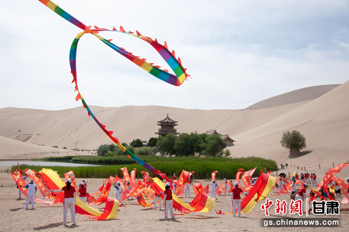 6月10日,敦煌市鳴沙山下,一場(chǎng)以敦煌市舞龍隊(duì)為首的20個(gè)健身舞蹈隊(duì)為廣大市民和游客獻(xiàn)上一臺(tái)臺(tái)精彩的舞蹈盛宴,吸引了眾多游客圍觀、拍照,在敦煌大漠度過(guò)一個(gè)難忘的端午節(jié)。王斌銀 攝