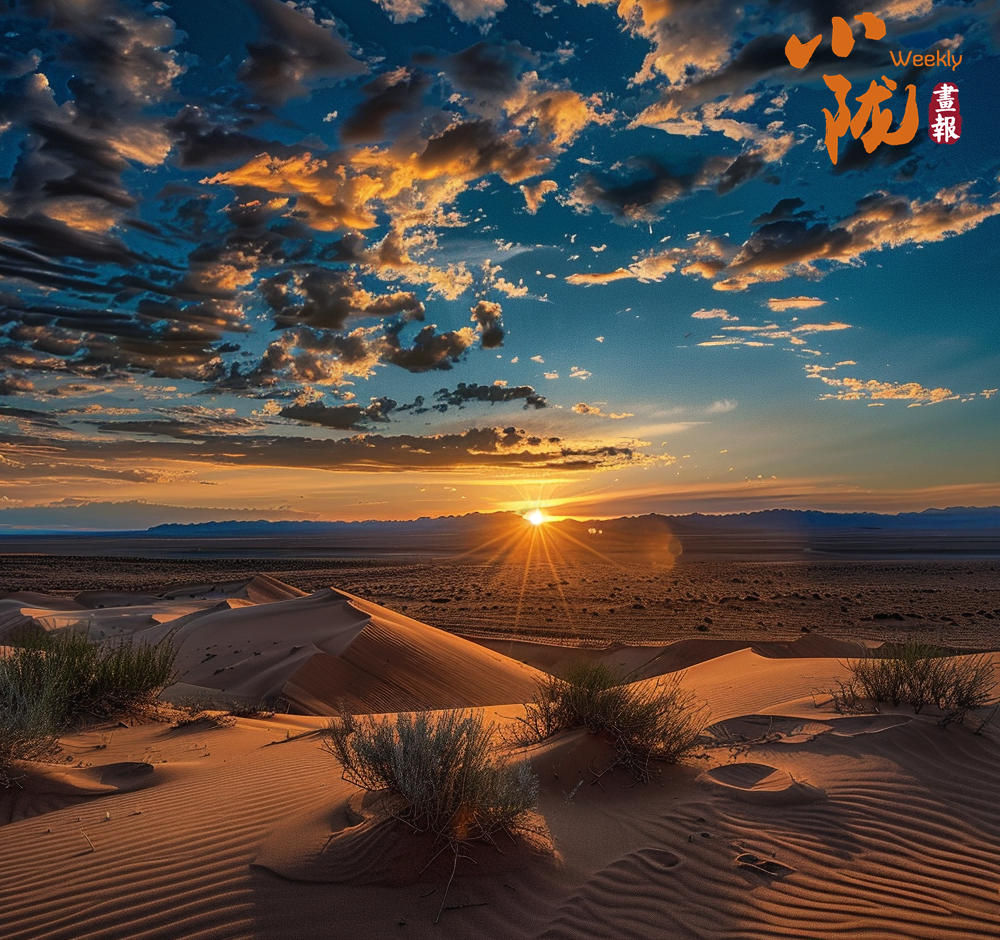 沙漠的沙粒在晚霞的映射下變得金黃而溫暖,仿佛覆蓋了一層光暈。遠(yuǎn)處的山峰也被晚霞點(diǎn)亮,宛如一座座火焰般迎接著夜晚的到來(lái)。