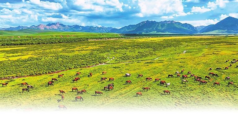 白雪皚皚的祁連山下,一眼望不到邊的大片牧草青翠碧綠,色彩斑斕的野花競(jìng)相開(kāi)放,擁有百萬(wàn)畝草原的山丹馬場(chǎng)如巨幅彩色畫(huà)卷徐徐展開(kāi)。