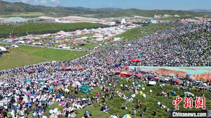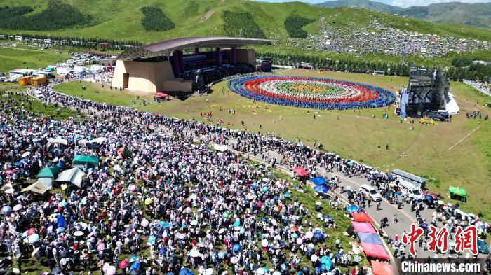 8月4日,人們在當周草原觀看九色甘南香巴拉旅游藝術(shù)節(jié)開幕式表演。當日,第22屆九色甘南香巴拉旅游藝術(shù)節(jié)在甘肅省甘南藏族自治州當周草原開幕。人們身著節(jié)日盛裝載歌載舞、歡聚一堂,馬隊巡游、千人鍋莊舞等活動精彩上演。九色甘南香巴拉旅游藝術(shù)節(jié)既是民眾浪山聚會的節(jié)日盛會,也是展現(xiàn)發(fā)展成就、擴大對外開放的重要窗口,更是展示民俗文化、促進廣泛交往交流交融的有效載體。(無人機照片)中新社記者 九美旦增 攝