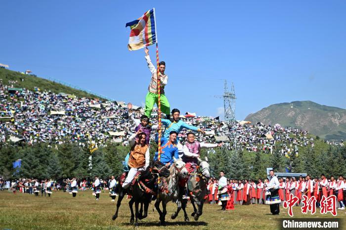 8月4日,藏族騎手在當周草原上表演馬隊巡游。當日,第22屆九色甘南香巴拉旅游藝術(shù)節(jié)在甘肅省甘南藏族自治州當周草原開幕。人們身著節(jié)日盛裝載歌載舞、歡聚一堂,馬隊巡游、千人鍋莊舞等活動精彩上演。九色甘南香巴拉旅游藝術(shù)節(jié)既是民眾浪山聚會的節(jié)日盛會,也是展現(xiàn)發(fā)展成就、擴大對外開放的重要窗口,更是展示民俗文化、促進廣泛交往交流交融的有效載體。中新社記者 九美旦增 攝
