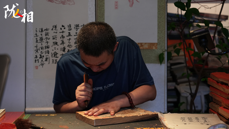 立秋前夕,在“脈望閣”書房里,安靜地只聽見屏氣凝神的呼吸聲,專業(yè)的刻刀、常用的手工宣紙、幾塊梨木板,靜寧縣傳統(tǒng)雕版印刷非遺傳承人李安樂正一絲不茍地在有繪畫的梨木上進行雕刻作品。