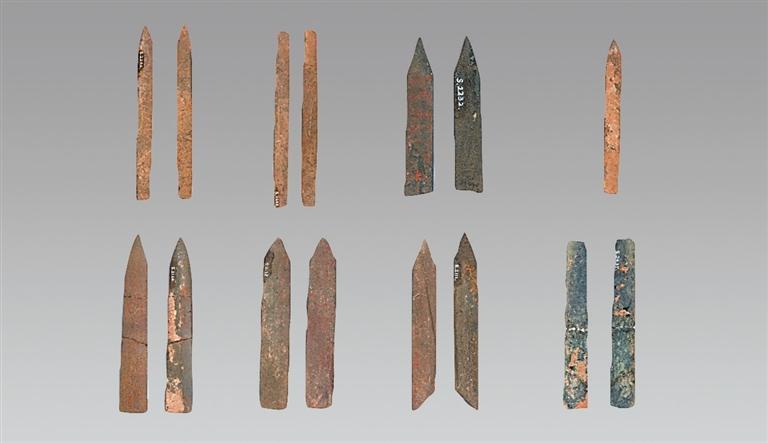 山西省絳縣橫水墓地出土。身呈長條形,中部起脊,兩刃斜直,刃緣鋒利,劍身橫截面呈菱形。莖格部平面呈“凸”字形,有闌,側(cè)闌凸起,橫截面呈“工”字形,后端較窄,有兩個圓穿。劍身近莖格處兩面均飾陰線人面紋。雙合范鑄造。兩面人面紋頭頂上方鑄銘文:“楚公逆□□中戈。”考古人員推斷,有可能該件器物的作器者為楚公逆,與晉侯墓地M64出土的楚公逆編鐘、宋代嘉魚縣出土的楚公逆鐘的作器者為同一人。