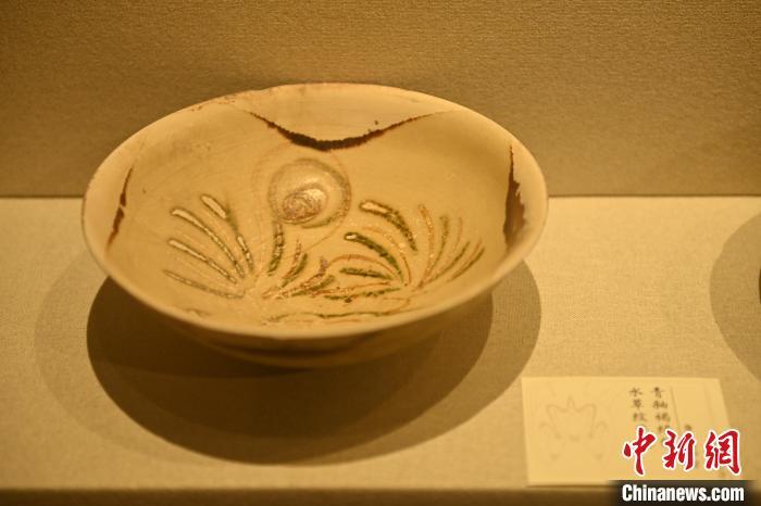 10月27日,在甘肅省博物館內(nèi)展陳的青釉褐綠彩水草紋瓷碗。中新社記者 李亞龍 攝