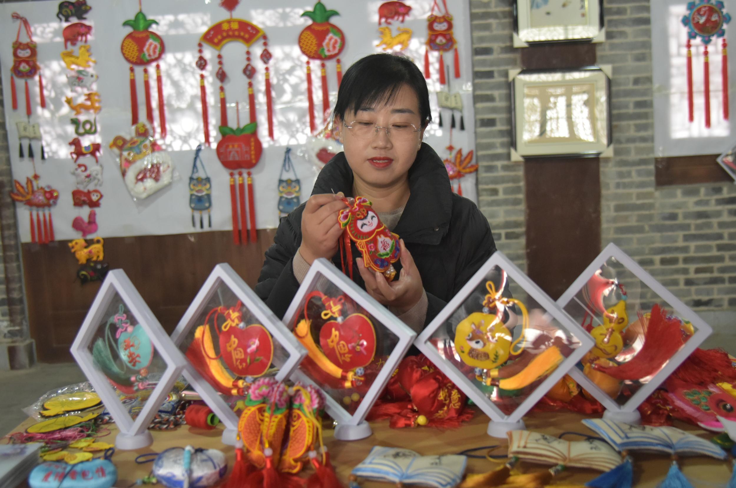 除了剪紙,鎮(zhèn)原縣香包、刺繡、書法等傳統(tǒng)文化藝術(shù)氛圍也很濃厚,深受廣大群眾喜愛。在文化一條街,十幾家書畫、香包、刺繡工作室緊挨,組成了一條文化長廊,除了銷售文創(chuàng)產(chǎn)品外,還承擔(dān)著非遺文化傳承和技藝培訓(xùn),熱鬧而又成氣候。“作為一名非遺傳承人,不僅要把自己的香包刺繡產(chǎn)品設(shè)計好、做精致,更重要的是要把這門技藝教給更多的人,讓香包、刺繡這門技藝更好地傳承下去。”慶陽香包刺繡非物質(zhì)文化遺產(chǎn)傳承人任艷艷說,自己在文化一條街已經(jīng)開店近十年了,帶出了很多巧媳婦巧婆婆,還不時受邀在縣內(nèi)外進(jìn)行培訓(xùn)指導(dǎo)。