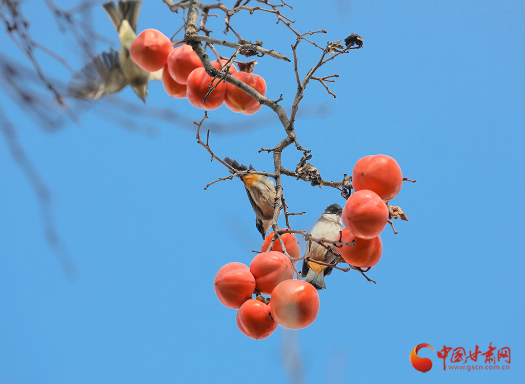 繁華落盡,枝條上一簇簇、一叢叢火紅的柿子在微風(fēng)中搖曳,吸引麻雀前來“聚餐”。麻雀們時(shí)而啁啾歡唱,時(shí)而蹦跳覓食,小巧的身影與柿子交織在一起,勾勒出一幅生動的冬日畫卷。