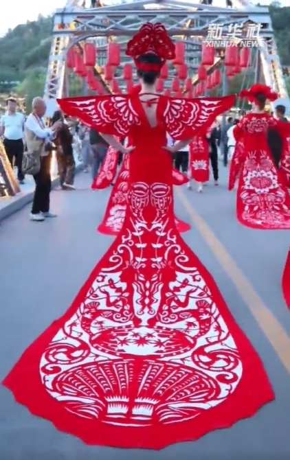 慶陽剪紙?jiān)从谏?、講究情趣,是勞動人民生產(chǎn)生活、情感氣質(zhì)、觀念習(xí)俗和文化傳承的結(jié)晶。著名民俗學(xué)家靳之林先生稱剪紙藝人是“真正的藝術(shù)家”。1986年,中央美術(shù)學(xué)院邀請鎮(zhèn)原縣民間美術(shù)大師祁秀梅赴北京進(jìn)行民間美術(shù)教學(xué)交流,向大學(xué)生演示民間剪紙。法國、日本、澳大利亞等國家的藝術(shù)家也多次專程到隴東考察民間剪紙藝術(shù)。慶陽剪紙已由鄉(xiāng)村婦女手中的小玩意,堂而皇之地步入了國家藝術(shù)殿堂——中國民間美術(shù)館,并在日、意、澳等國家展覽亮相。圖為身著慶陽剪紙服裝的模特們行走在蘭州中山橋上,驚艷了來往的游客。