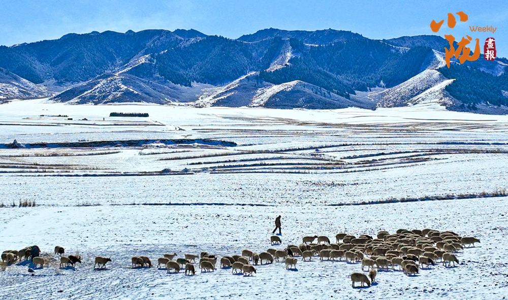 山腳下的牧民人家炊煙裊裊升起,與雪地、羊群、藍天構成了一幅和諧共生的春日畫卷。