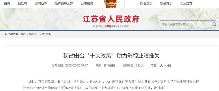 2月19日,江蘇省八部門聯(lián)合發(fā)布《關于支持全省電影業(yè)應對新冠肺炎疫情影響促進平穩(wěn)健康發(fā)展的政策措施》,即“影十條”,從落實稅收優(yōu)惠政策、加強財政支持力度、加大信貸投放、減免房租等十方面幫助電影業(yè)。
