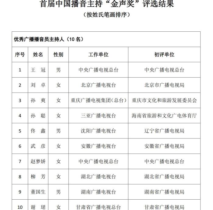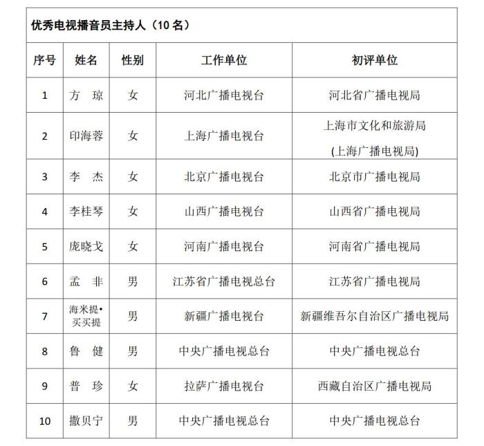 《通知》指出,根據(jù)《國家廣播電視總局辦公廳關于組織參加中國廣播電視節(jié)目獎•首屆中國播音主持“金聲獎”評選工作的通知》(廣電辦發(fā)〔2021〕277號),經(jīng)過初評、復評和終評,評選出優(yōu)秀廣播播音員主持人、優(yōu)秀電視播音員主持人各10名。現(xiàn)將評選結(jié)果予以公示,公示期為5個工作日。