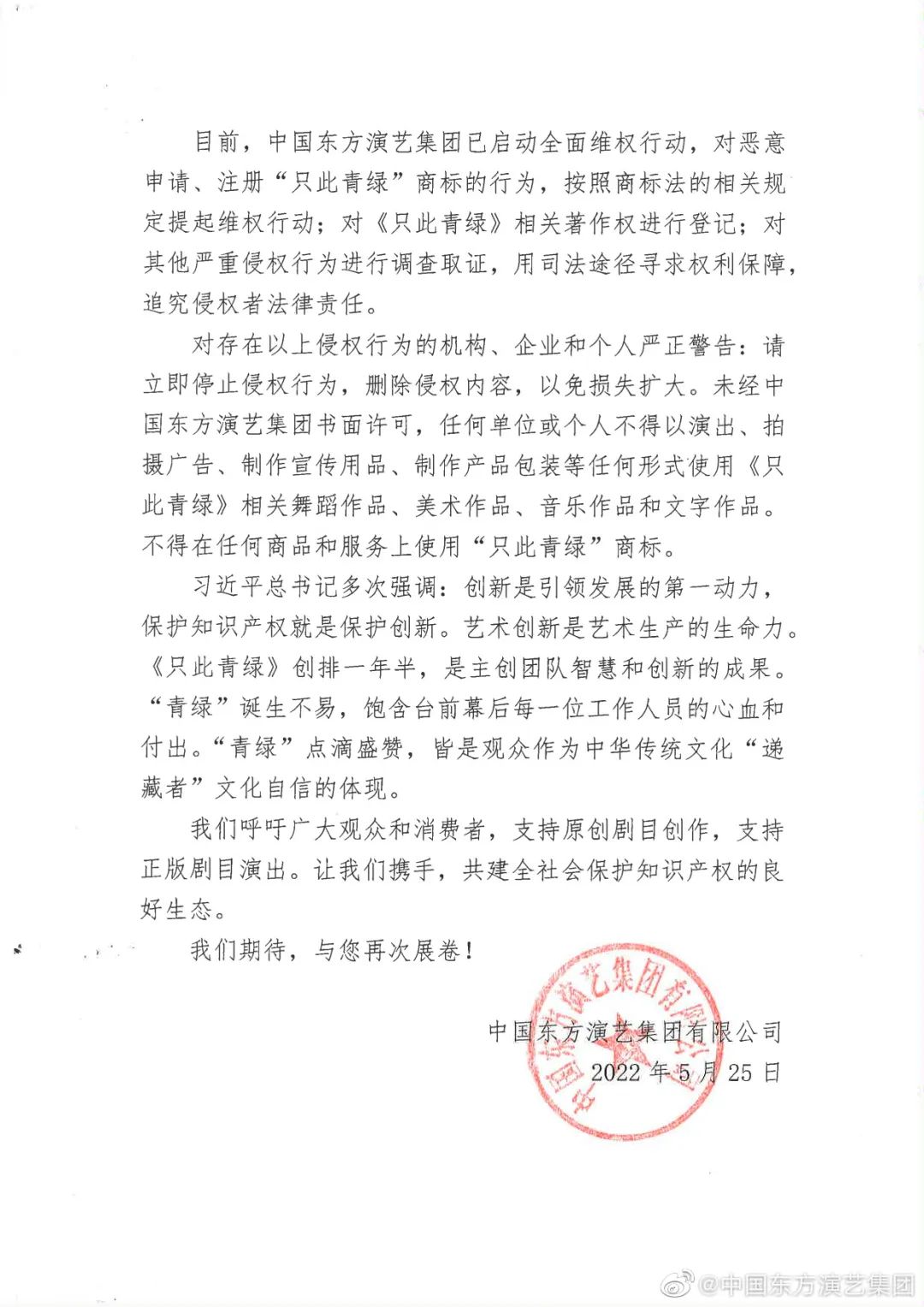 未經(jīng)中國東方演藝集團書面許可,任何單位或個人不得以演出、拍攝廣告、制作宣傳用品、制作產(chǎn)品包裝等任何形式使用《只此青綠》相關(guān)舞蹈作品、美術(shù)作品、音樂作品和文字作品。不得在任何商品和服務(wù)上使用“只此青綠”商標(biāo)。