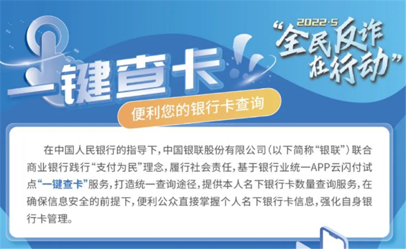 為解決群眾對(duì)于跨行銀行卡賬戶查詢的訴求,2021年12月,人民銀行指導(dǎo)中國(guó)銀聯(lián)股份有限公司聯(lián)合商業(yè)銀行基于銀行業(yè)統(tǒng)一APP云閃付試點(diǎn)“一鍵查卡”功能,打造統(tǒng)一查詢途徑,向公眾提供銀行卡數(shù)量、每張卡的銀行名稱、借貸記屬性、脫敏卡號(hào)等信息的查詢,在確保信息安全的前提下,便利公眾直接掌握個(gè)人名下銀行卡信息,強(qiáng)化自身銀行卡管理。
