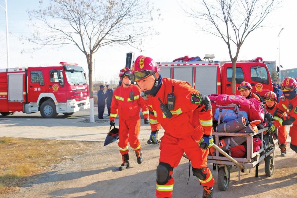 地震救援拉動訓(xùn)練中的劉學(xué)法?!√m州新區(qū)消防救援支隊供圖