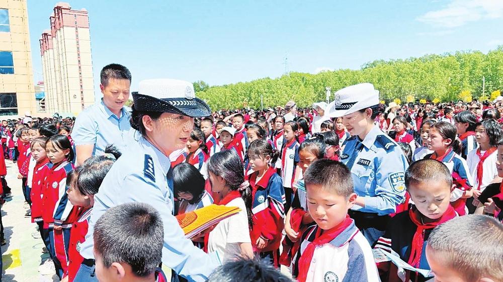 民警向?qū)W生發(fā)放宣傳資料。6月26日,積石山縣公安局交警大隊民警走進城西小學,開展“知危險會避險”交通安全宣傳教育活動,給學生們上了一堂暑期交通安全課。 新甘肅·甘肅法治報通訊員趙小紅攝