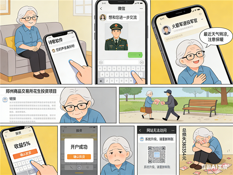 警方拆解該案騙術(shù)發(fā)現(xiàn),騙子共分七步將紀(jì)奶奶從“詩友”變成“提款機(jī)”。第一步,潛入詩歌朗誦這類中老年人聚集的興趣社群,精準(zhǔn)篩選目標(biāo);第二步,以“聲音好聽”為切入點,通過情感鋪墊營造“黃昏戀”錯覺,建立情感依賴;第三步,多次切換聊天軟件,躲避平臺反詐監(jiān)測;第四步,偽裝“火箭軍”身份,利用老一輩對軍人的天然信任感,以國家信譽(yù)背書;第五步,讓老人幫忙操作虛假賬戶,親眼見證“穩(wěn)賺5%”的假象;第六步,邀請老人自己投資,誘導(dǎo)其向個人銀行卡轉(zhuǎn)賬;第七步,要求線下現(xiàn)金交易,繞過銀行風(fēng)控,增加資金追回難度。
